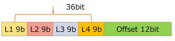 ページテーブル内のインデックスは、仮想アドレスを9bit単位の4分割(計36bit)で管理しており、1分割単位で仮想アドレスと物理アドレス間のアドレッシングを行っています。最終的に12bitのオフセットアドレス(この12bitのオフセットについては仮想アドレス、物理アドレスの間で変化しません)を加算し、物理アドレスを解決しています。